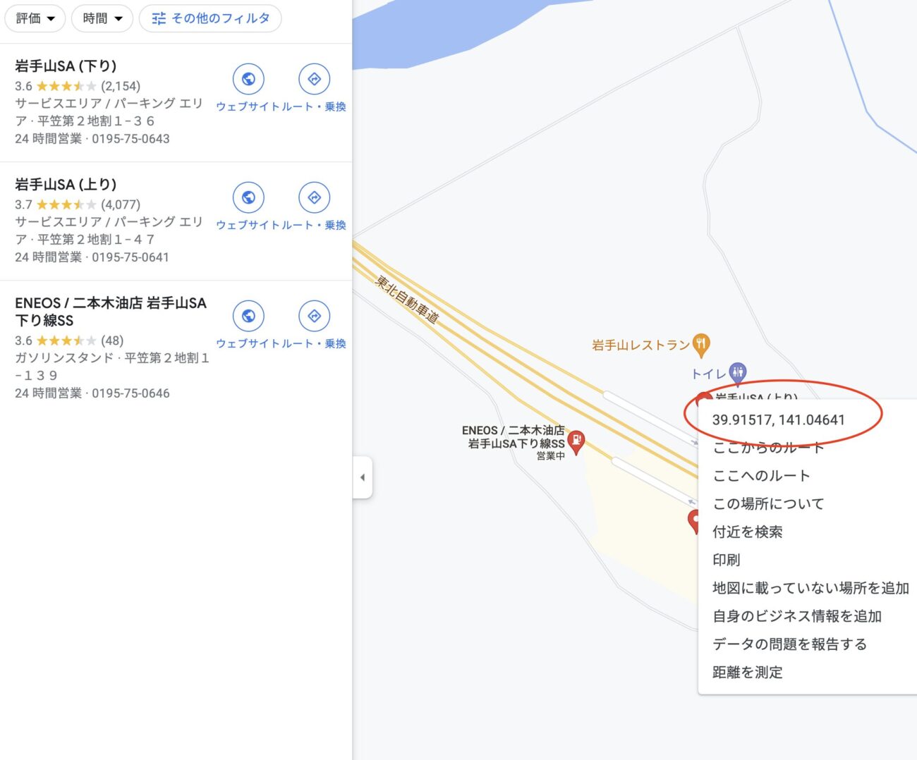 まず、大体、この辺りかな?という場所をGoogleマップで探してから位置情報をコピーしました。