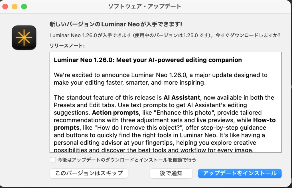 私のLuminar NEOを起動したらアップデート通知があり、早速実施しました。