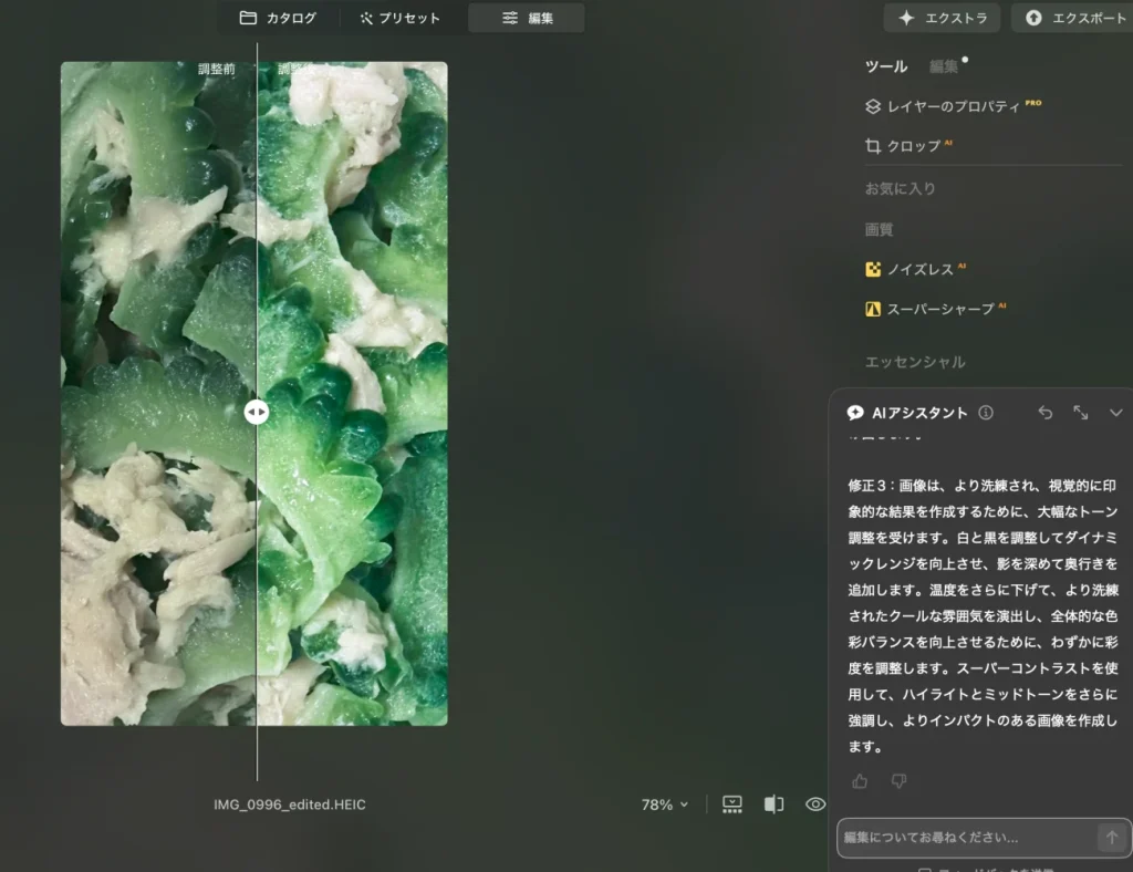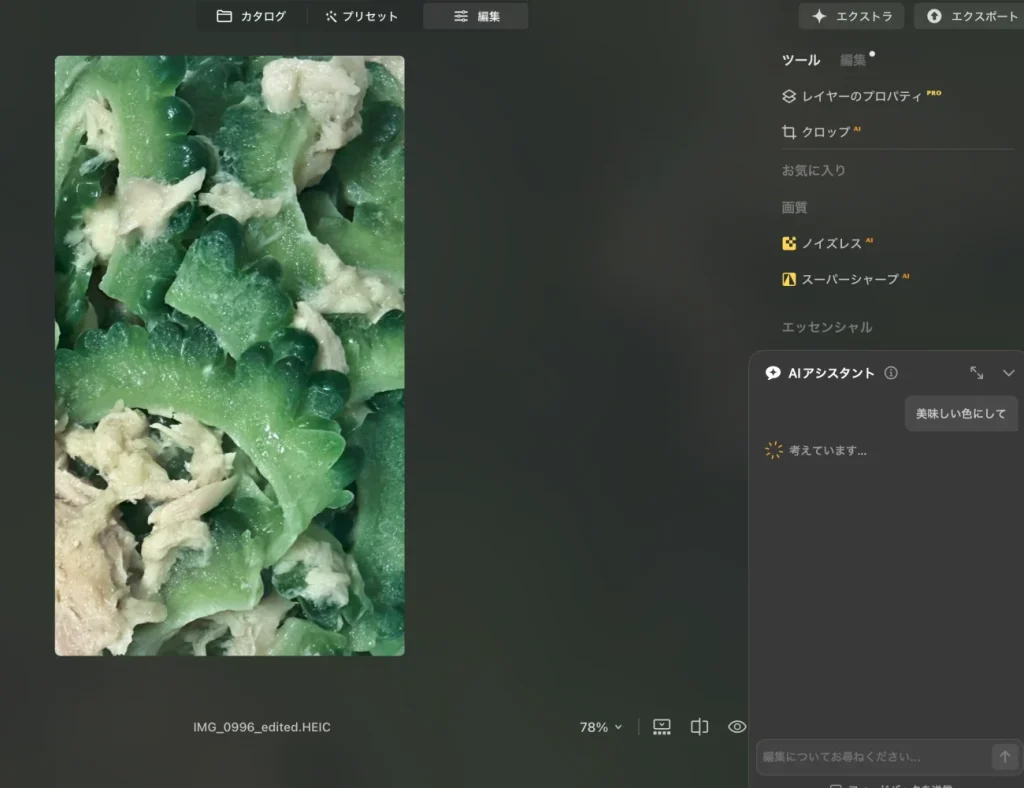 私の料理写真を題材に「テキストコマンド」で画像調整