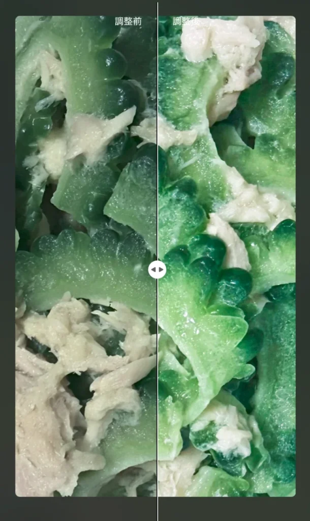 この写真は私が畑で育てたゴーヤにシーチキンを混ぜたものです。全体的に暗く色も不味そうな感じなので調整する必要がある写真です。