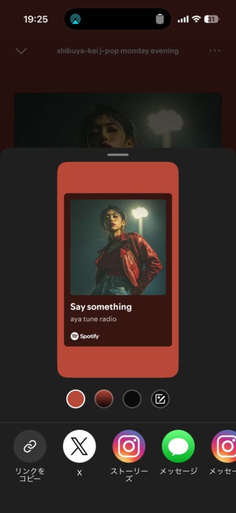 Spotifyなら「この曲良い」と思ったアーティストさんの曲をSNSへシェアしたい時、ワンクリックで超簡単だし、その過程で見栄えする投稿フォーマットも簡単に選べます。