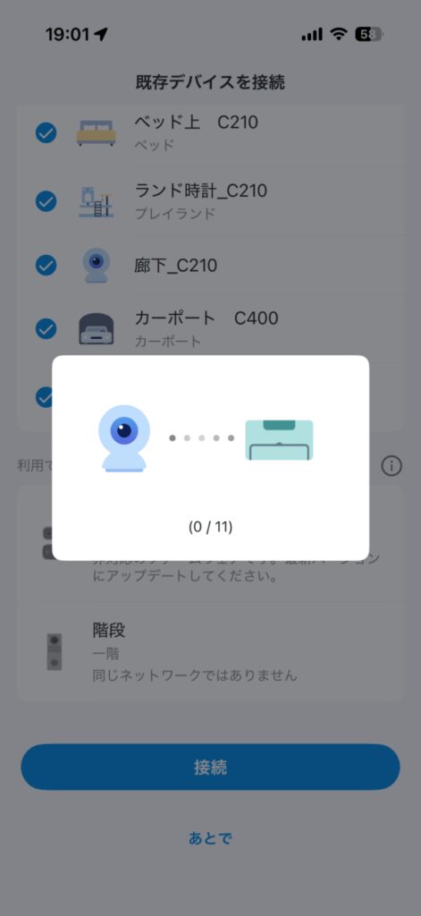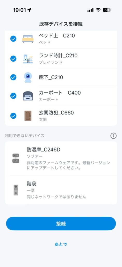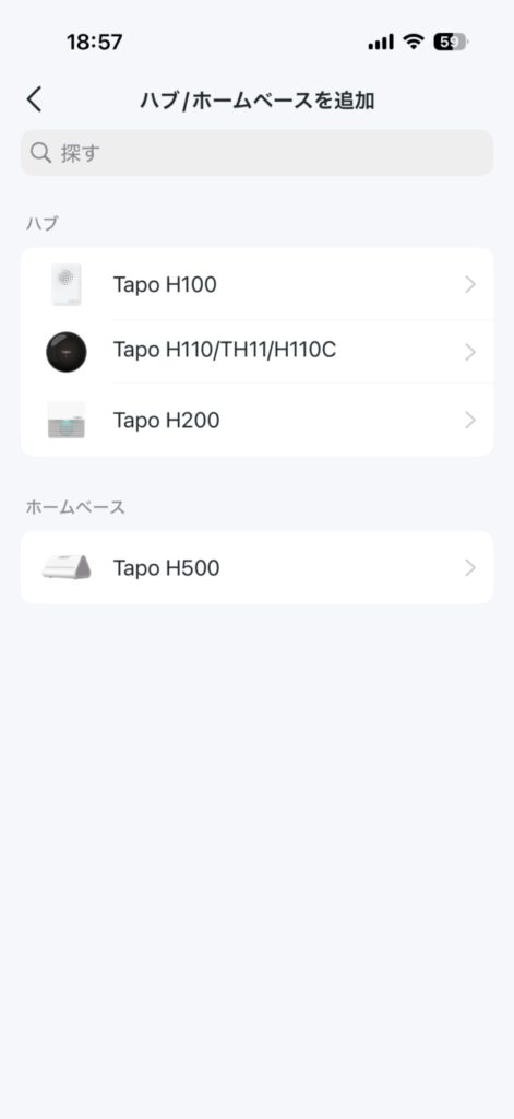 Wi-Fi設定がサラッと完成すると、我が家でTapo H500に接続する可能性があるカメラやドアホンなど候補が表示されます