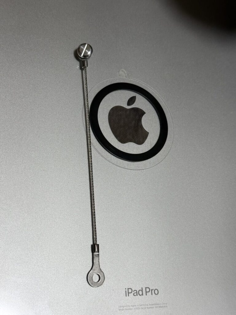 実際のワイヤーがこちらです。サイズ感の為にiPad M4 Pro13インチの上に乗せてます。このネジは本体の裏面に付けて、リングを壁や付属の金属プレートに付けます。