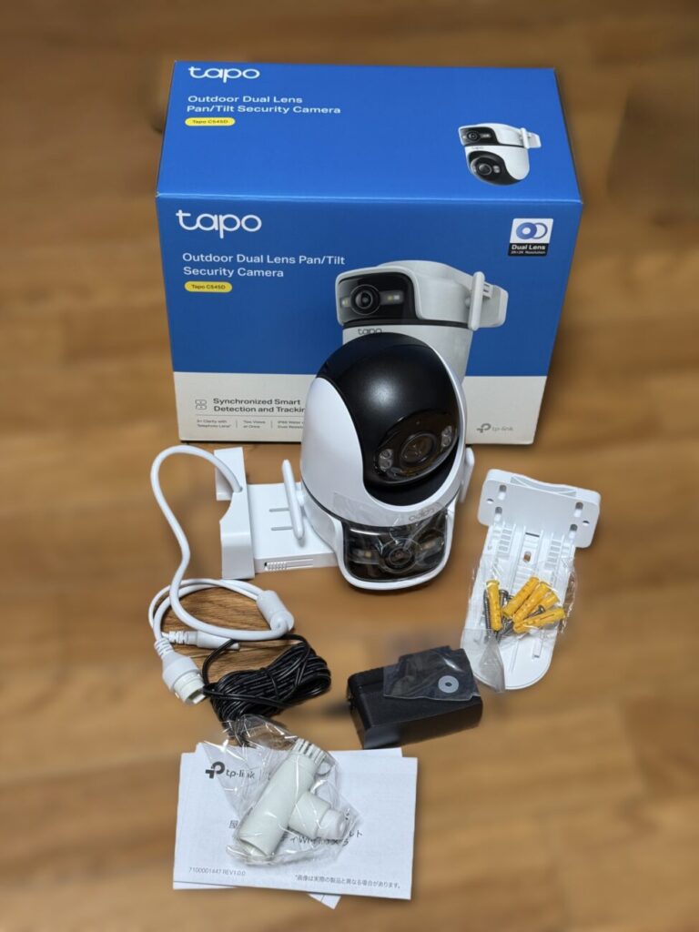 | 製品構成 | Tapo C545D本体×1 取り付け用台座×1 位置決めシール×1 取り付け用ネジ×4 取り付け用アンカー×4 防水シール×1 防水ケーブルアタッチメント×1 電源アダプター×1 かんたん設定ガイド |