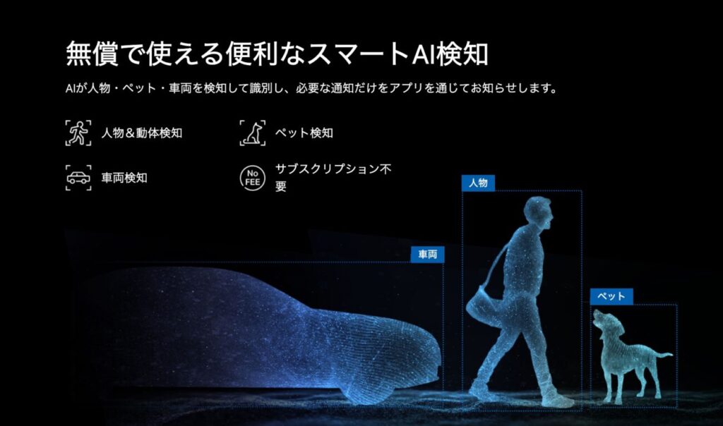- スマートAI検知:AIが人物・ペット・車両を検知して識別し、必要な通知だけをアプリを通じてお知らせします。