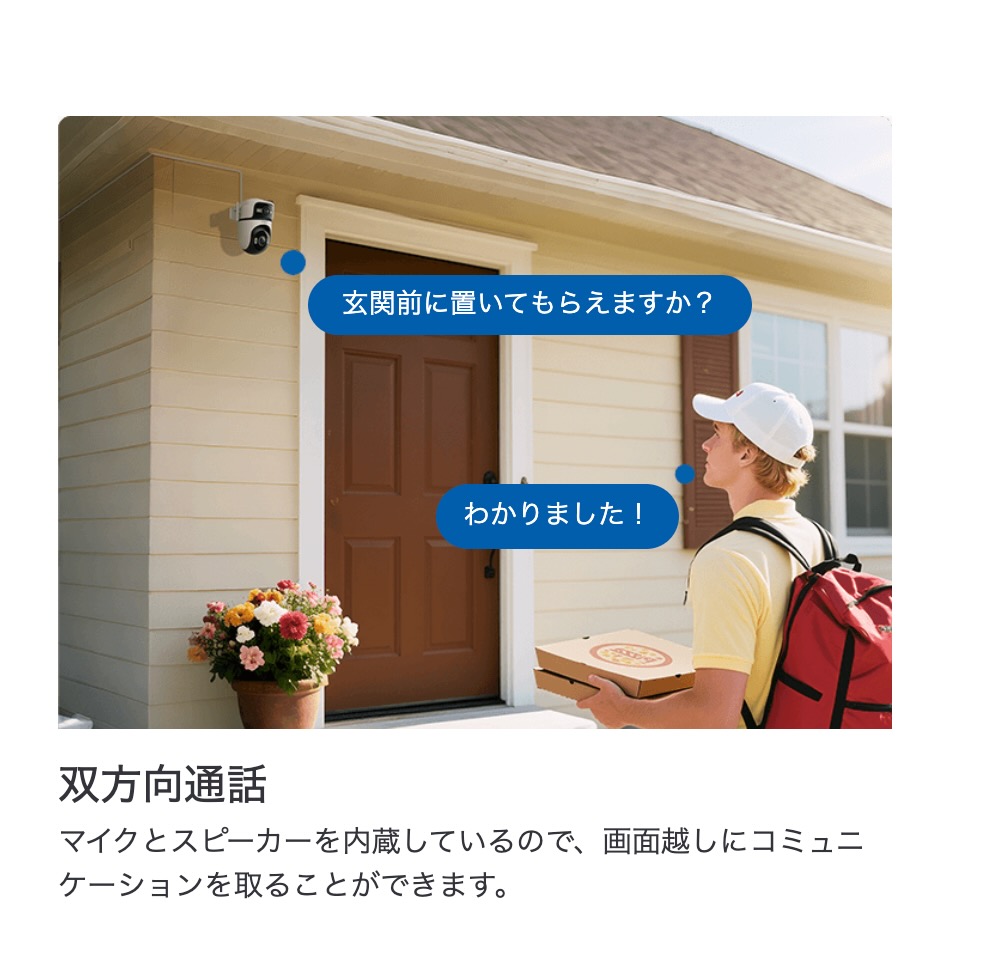 双方向通話可能なので、留守の時に宅配便が来た場合など置き場所を指示したりすることが可能です。通常のインターホンは在宅の時にしか対応ができませんが、このカメラが設置してある玄関であれば屋外にても遠く離れた他の県にいたとしても、不在時の来客に対して通話が可能です。