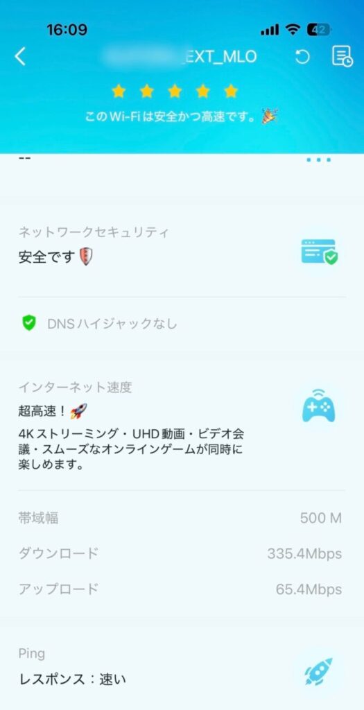 ダウンロードで335Mbpsという値は、メインDeco BE68からWi-Fiバックホールで繋がる2段目Deco BE68ノードにiPhoneを繋いだ場合と比較しても遜色ないくらい良好なスピードです。