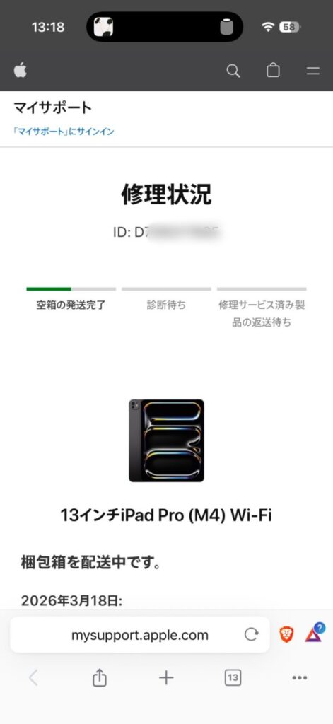 Appleサポートは三連休だとしても、修理は進まないとしても、届いたステータス管理は出来ないのだろうか。と思う。