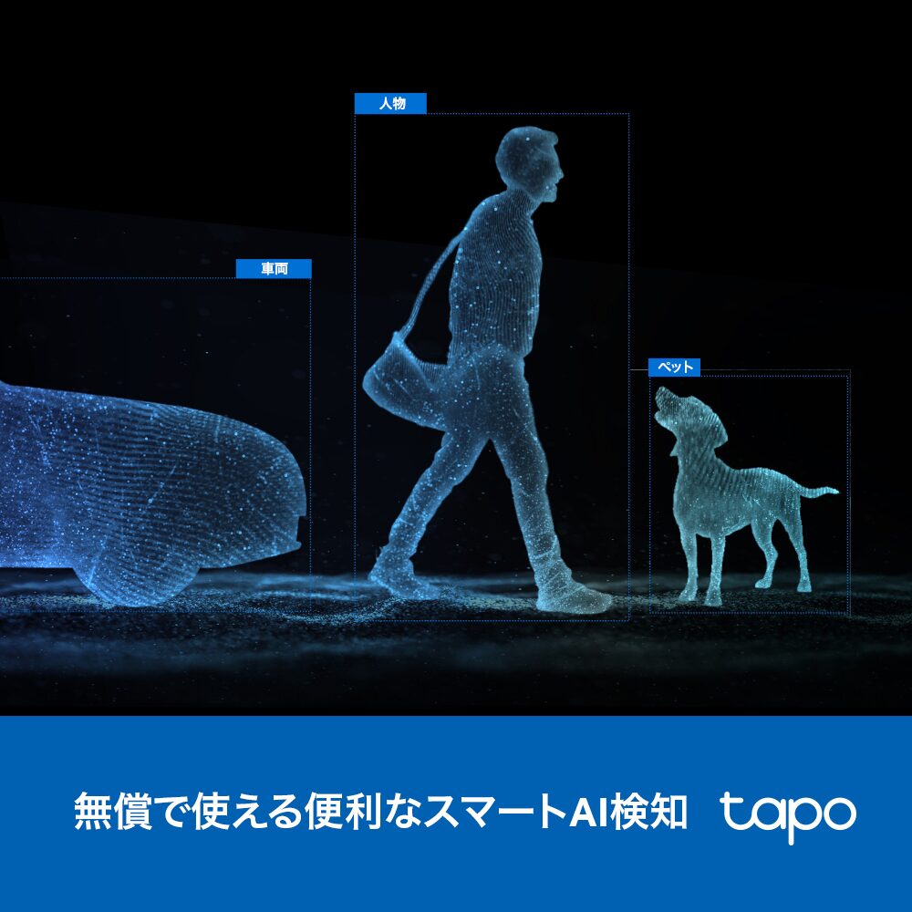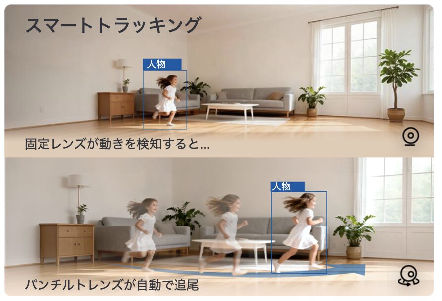 - スマートAI検知:AIが人物・ペット・赤ちゃんの泣き声等を検知して識別し、必要な通知だけをアプリを通じてお知らせします。