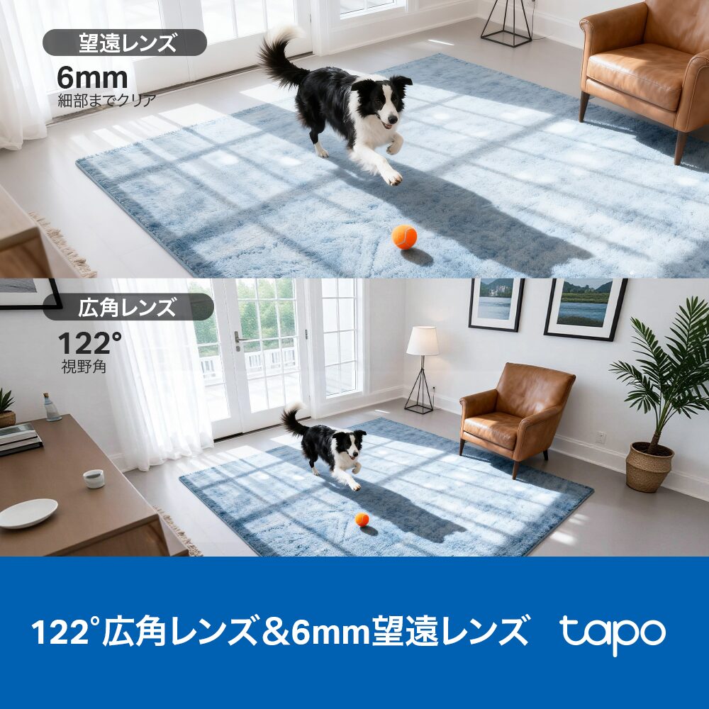 - デュアルレンズ搭載:122°の視野角を持つ固定レンズ(広角)とパンチルトレンズ(6mm望遠)を備え、広範囲を細部までクリアに捉えます。